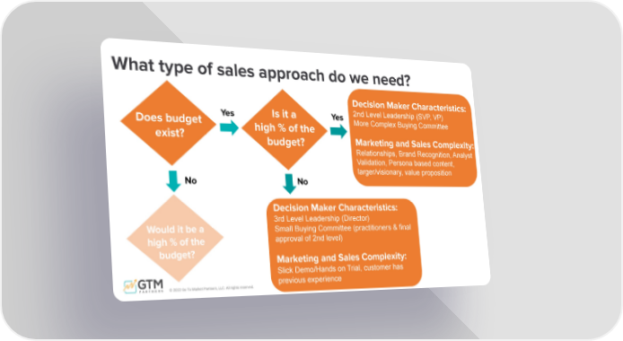 © 2022 Go To Market Partners, LLC. All rights reserved. What type of sales approach do we need? Does budget exist? Is it a high % of the budget? Decision Maker Characteristics: 2nd Level Leadership (SVP, VP) More Complex Buying Committee Marketing and Sales Complexity: Relationships, Brand Recognition, Analyst Validation, Persona based content, larger/visionary, value proposition Ye s No No Ye s Would it be a high % of the budget? Decision Maker Characteristics: 3rd Level Leadership (Director) Small Buying Committee (practitioners & final approval of 2nd level) Marketing and Sales Complexity: Slick Demo/Hands on Trial, customer has previous experience