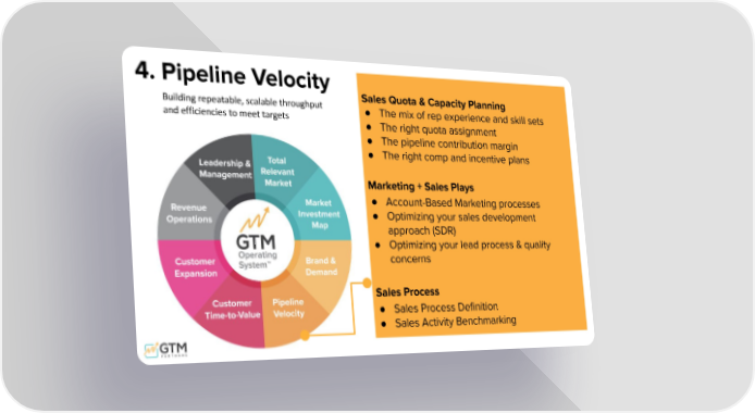 4. Pipeline Velocity Building repeatable, scalable throughput and efficiencies to meet targets Sales Quota & Capacity Planning ● The mix of rep experience and skill sets ● The right quota assignment ● The pipeline contribution margin ● The right comp and incentive plans Marketing + Sales Plays ● Account-Based Marketing processes ● Optimizing your sales development approach (SDR) ● Optimizing your lead process & quality concerns Sales Process ● Sales Process Definition ● Sales Activity Benchmarking