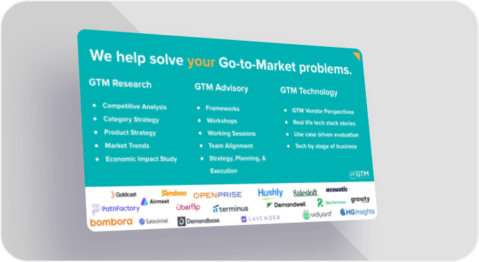 GTM Research ● Competitive Analysis ● Category Strategy ● Product Strategy ● Market Trends ● Economic Impact Study GTM Advisory ● Frameworks ● Workshops ● Working Sessions ● Team Alignment ● Strategy, Planning, & Execution GTM Technology ● GTM Vendor Perspectives ● Real life tech stack stories ● Use case driven evaluation ● Tech by stage of business We help solve your Go-to-Market problems.