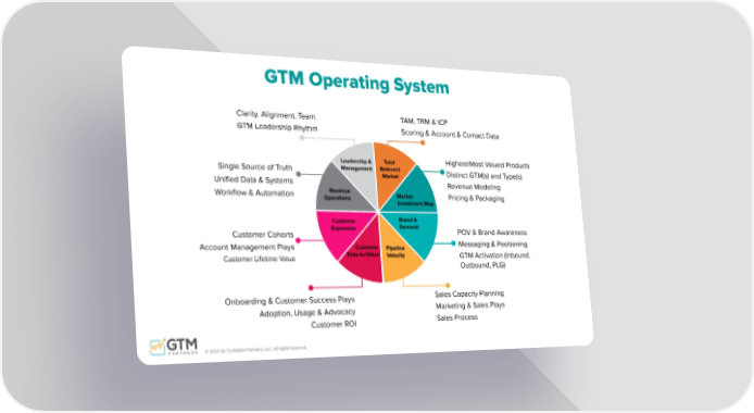 © 2022 Go To Market Partners, LLC. All rights reserved. GTM Operating System Market Investment Map Pipeline Velocity Customer Time-to-Value Customer Expansion Revenue Operations Leadership & Management Brand & Demand Total Relevant Market TAM, TRM & ICP Scoring & Account & Contact Data Highest/Most Valued Products Distinct GTM(s) and Type(s) Revenue Modeling Pricing & Packaging POV & Brand Awareness Messaging & Positioning GTM Activation (Inbound, Outbound, PLG) Sales Capacity Planning Marketing & Sales Plays Sales Process Onboarding & Customer Success Plays Adoption, Usage & Advocacy Customer ROI Customer Cohorts Account Management Plays Customer Lifetime Value Single Source of Truth Unified Data & Systems Workflow & Automation Clarity. Alignment. Team. GTM Leadership Rhythm