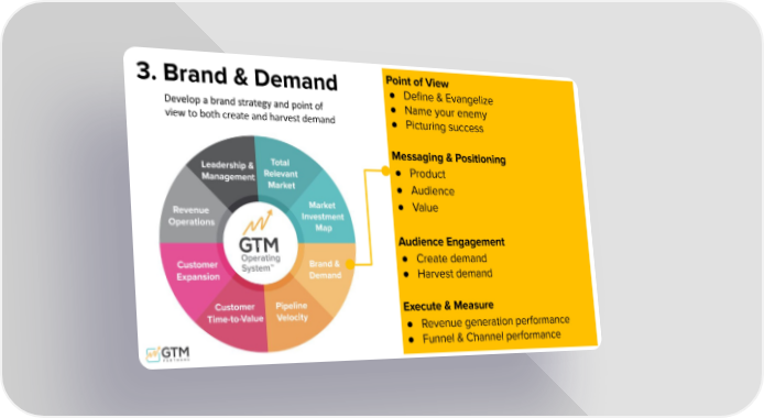 Point of View ● Define & Evangelize ● Name your enemy ● Picturing success Messaging & Positioning ● Product ● Audience ● Value Audience Engagement ● Create demand ● Harvest demand Execute & Measure ● Revenue generation performance ● Funnel & Channel performance 3. Brand & Demand Develop a brand strategy and point of view to both create and harvest demand