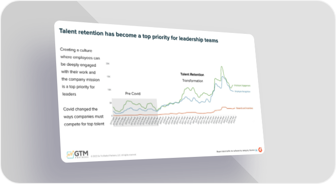 Pre Covid Talent Retention Transformation Talent retention has become a top priority for leadership teams Creating a culture where employees can be deeply engaged with their work and the company mission is a top priority for leaders Covid changed the ways companies must compete for top talent © 2022 Go To Market Partners, LLC. All rights reserved. Buyer intent traffic for software by category. Source: G2