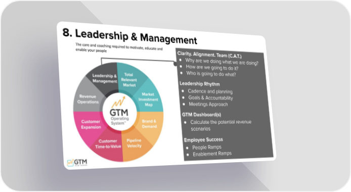 Clarity. Alignment. Team (C.A.T.) ● Why are we doing what we are doing? ● How are we going to do it? ● Who is going to do what? Leadership Rhythm ● Cadence and planning ● Goals & Accountability ● Meetings Approach GTM Dashboard(s) ● Calculate the potential revenue scenarios Employee Success ● People Ramps ● Enablement Ramps 8. Leadership & Management The care and coaching required to motivate, educate and enable your people