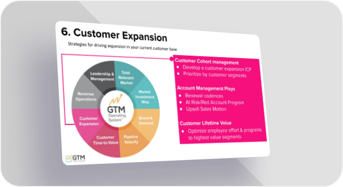 Customer Cohort management ● Develop a customer expansion ICP ● Prioritize by customer segments Account Management Plays ● Renewal cadences ● At Risk/Red Account Program ● Upsell Sales Motion Customer Lifetime Value ● Optimize employee effort & programs to highest value segments 6. Customer Expansion Strategies for driving expansion in your current customer base