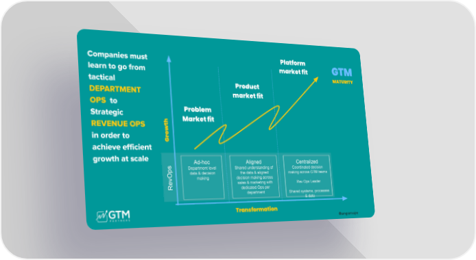 @sangramvajre Companies must learn to go from tactical DEPARTMENT OPS to Strategic REVENUE OPS in order to achieve efficient growth at scale Growth Transformation Problem Market fit Product market fit Platform market fit GTM MATURITY Ad-hoc Department level data & decision making Aligned Shared understanding of the data & aligned decision making across sales & marketing with dedicated Ops per department Centralized Coordinated decision making across GTM teams Rev Ops Leader Shared systems, processes & data RevOps